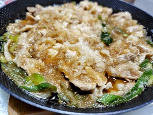 豚肉を炒めて、めんつゆ、みりん、大根のおろし汁で10分ほど煮て、大根おろしいれて一煮立ち、といったメニューです。