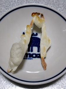 職場近くの和菓子屋さんで餅の切り落としが売られていて、その中のほっそいほっそいやつを2つ焼いたら一体化しました(笑)