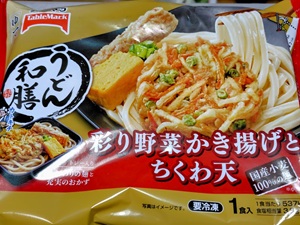 野菜かき揚げとちくわ天が入っており、器ごとレンチンするだけうどん。