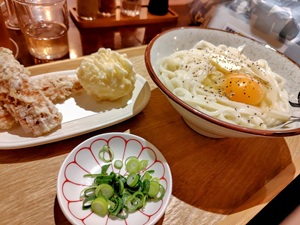 釜バターとちくたまセットを頼んで喜んでたんですが、釜揚げうどんに卵を乗せた釜たまと、半熟卵の天ぷらって、卵食べすぎじゃね(笑)?