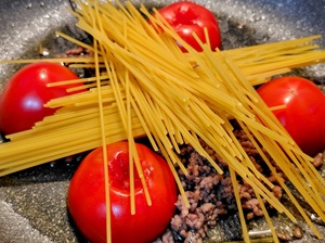 二つ割りにしたトマト4つをフライパンに入れ、ミンチを入れ、パスタを入れ、そのまま火をつける(水分やら調味料やらもいれてたかな)