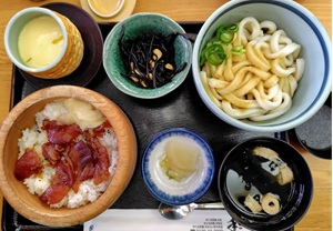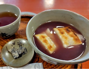朝、赤福ぜんざいをいただき、昼、伊勢うどんとてこね寿司をいただき。