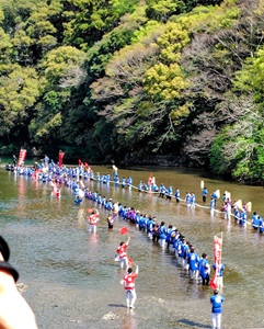 まずは宇治橋を渡るんですが、川の中に人が入ってるんですよ。それを見てる大勢の人。